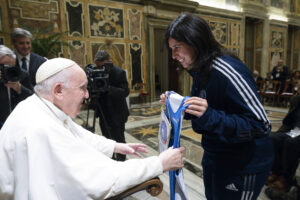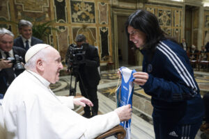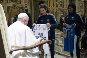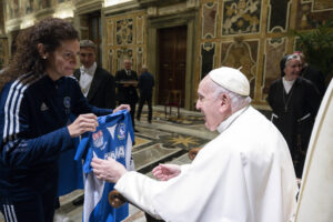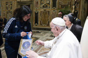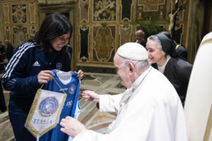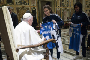In rappresentanza del Pio Istituto Sordi e della Federazione Sport Sordi Italia, erano presenti Simona Cascio e Ilaria Galbusera, rispettivamente capitana della Nazionale di Basket e capitana della Nazionale di Volley che, molto emozionate, hanno consegnato nelle mani del Pontefice le divise di rappresentanza.